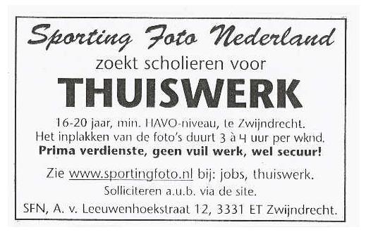Je krijgt de foto's op vrijdagmiddag aangeleverd, soms donderdag al, en het wordt maandag-morgen weer opgehaald. Je krijgt van Sporting Foto uitgebreide instructie hoe je moet werken. Dat gebeurt een keer 's avonds op kantoor. Eventueel ga je de eerste keer onder begeleiding van een ervaren thuiswerkster albums inplakken. Ook krijg je van ons uitgebreide documentatie thuis. Dat is een handleidinkje waar alles instaat wat je moet weten. En we hebben tegenwoordig een eigen instructie-internetforum waar alles op staat, met voorbeelden enz. Hartstikke handig en duidelijk. Dat is misschien 2 uur leeswerk, waar je ook nog voor betaald krijgt. Wij gaan ervan uit dat je je die materie snel en serieus eigen maakt, des te sneller gaat het inplakken van de albums precies naar ons zin. In het begin zullen wij je plakwerk goed controleren en je wijzen op eventuele fouten. De bedoeling is natuurlijk dat je daarvan leert. Zo kom je er stapsgewijs "in". Later krijg je nog een keer een herhalings-instructie bij ons op kantoor. Geven we je nog tips en zo. De ervaring leert dat verreweg de meeste thuiswerksters dit voor een lange tijd blijven doen. Dit zal deels te maken hebben met de zeer goede vergoeding die we betalen. Je moet namelijk erg secuur en netjes werken, en ook: zoveel mogelijk dingen uitzoeken, nakijken en problemen oplossen. Hoe beter jij dit doet, hoe prettiger het voor ons werken is op kantoor. Vandaar dat we vrij streng zijn, maar dus ook goed betalen. En het is voor sommige scholieren/studenten erg aantrekkelijk/handig, zélf te kunnen bepalen wanneer ze werken. Omdat ze bijvoorbeeld op zaterdags sporten en door competitie-wedstrijden het steeds wisselt hoelaat ze moeten spelen. Waardoor ze bijv geen vast zaterdagbaantje in een winkel kunnen nemen. En nogmaals, we helpen je aan alle kanten, met van alles en nog wat. Het is helemaal niet zo moeilijk, als je maar wel leest/leert. En je maar wel inzet toont. Desondanks vragen we van de kandidaten dat ze een opleiding doen op minimaal Havo-niveau.